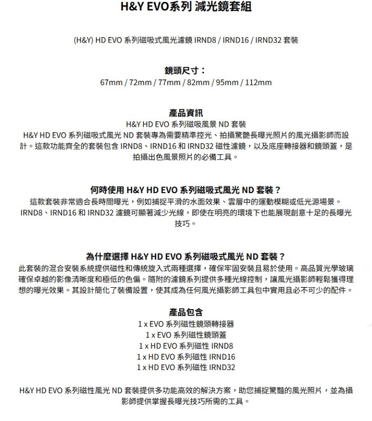 ☆閃新☆H&Y HD EVO系列 磁吸 減光鏡套組 ND8/ND16/ND32(公司貨)