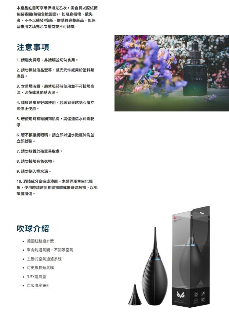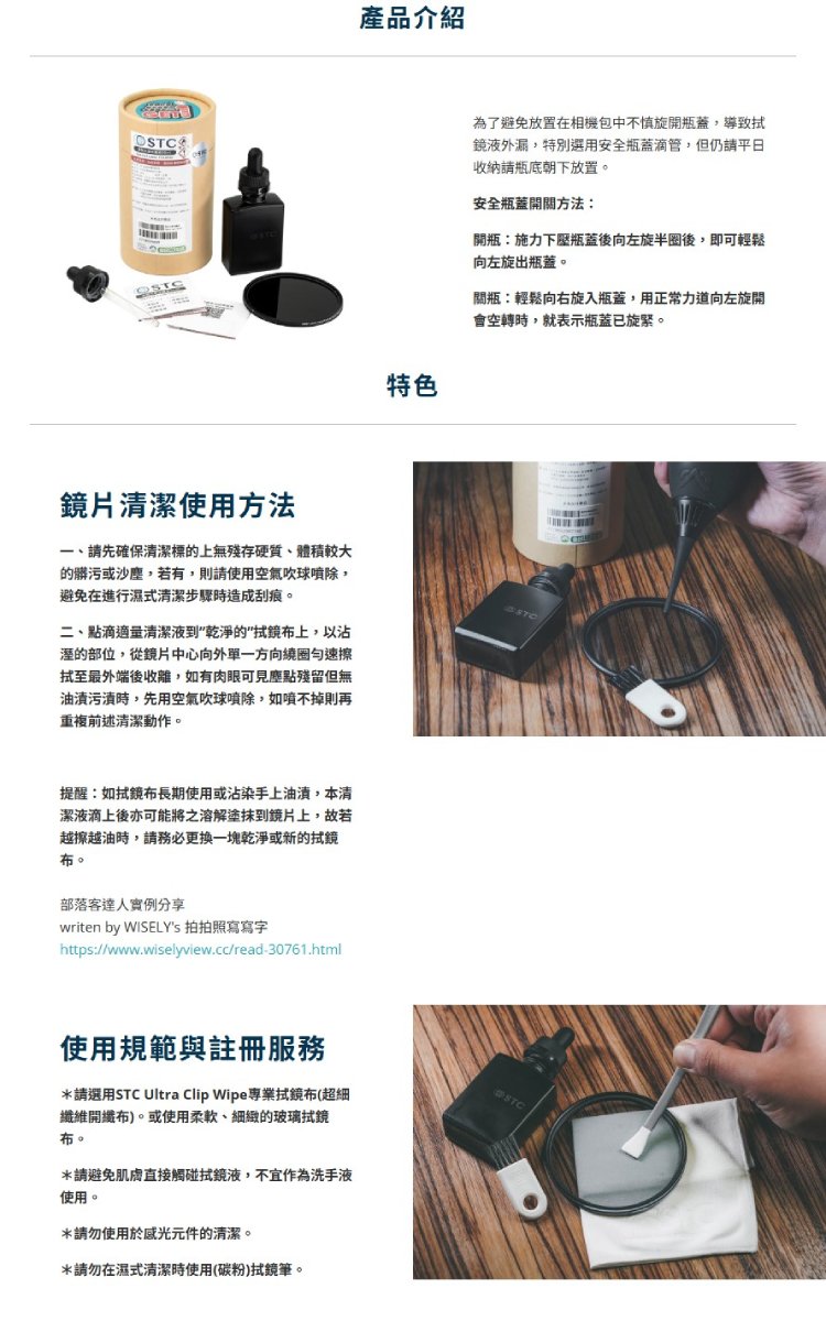 STC獨家推出不加水稀釋的高效光學鏡片專用清潔液,具高清潔力、高揮發度(無酒精揮發後的彩虹紋)、快速溶油且不易殘留等優點,清潔鏡片不用再反反覆覆擦九遍,是省時省力的好幫手。並選用安全隔曬玻璃瓶身,以及抗腐蝕乳膠頭玻璃滴管,方便取量更確保用得安心。