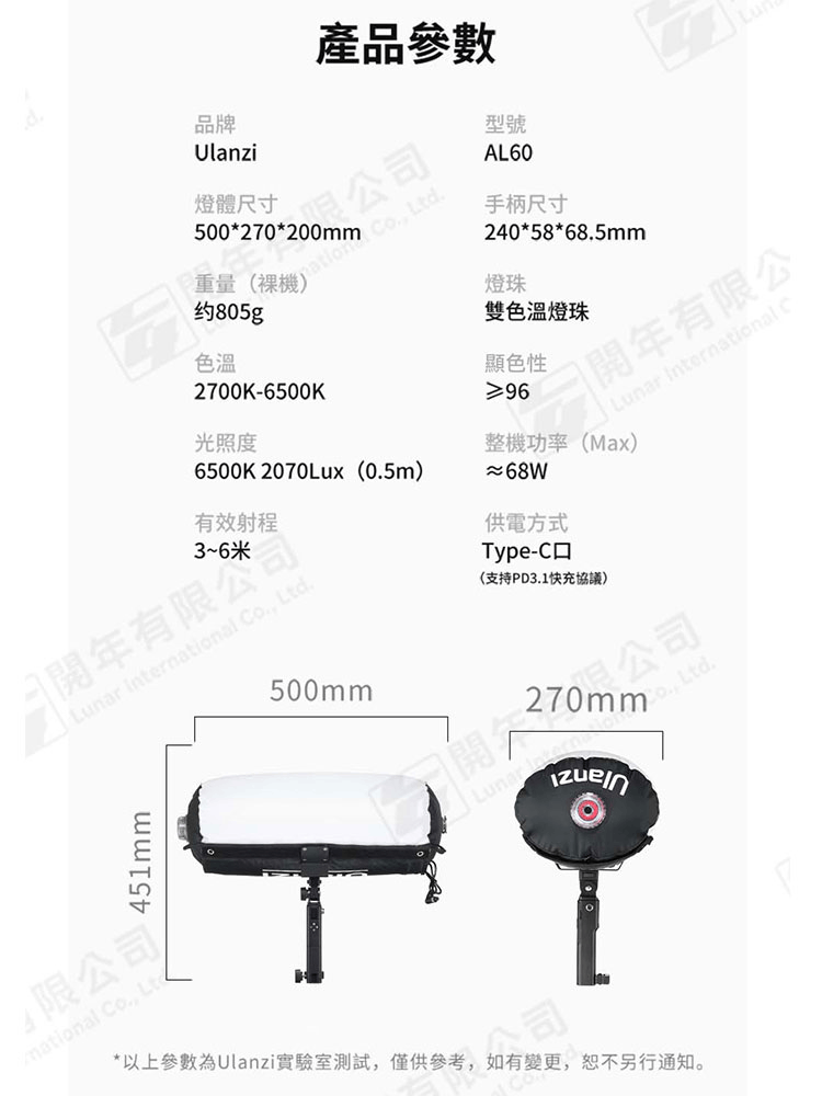 ☆閃新☆Ulanzi AL60【大白】60W 充氣式 攝影 LED 補光燈(雙色溫)公司貨