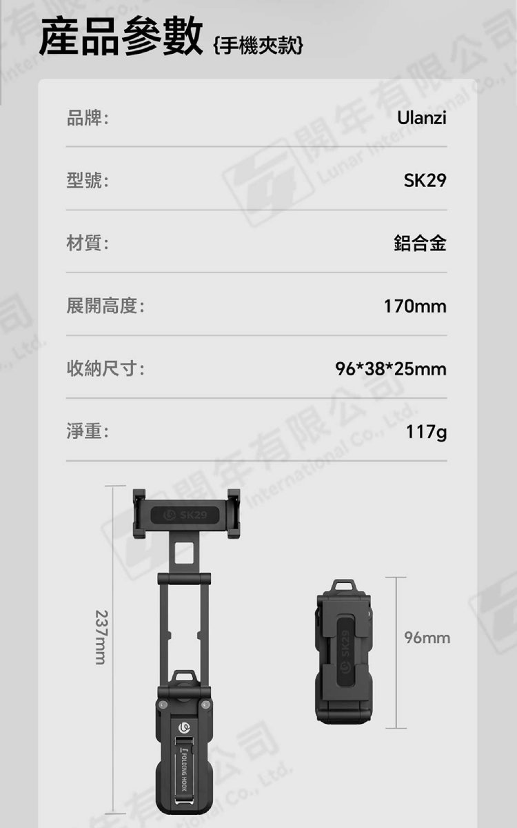 ☆閃新☆Ulanzi SK29 多用攝影手機支架 M100 SK29 (手機夾款) 1/4"Arri定位孔、四段式折疊、一體式收納、底部隱藏掛勾