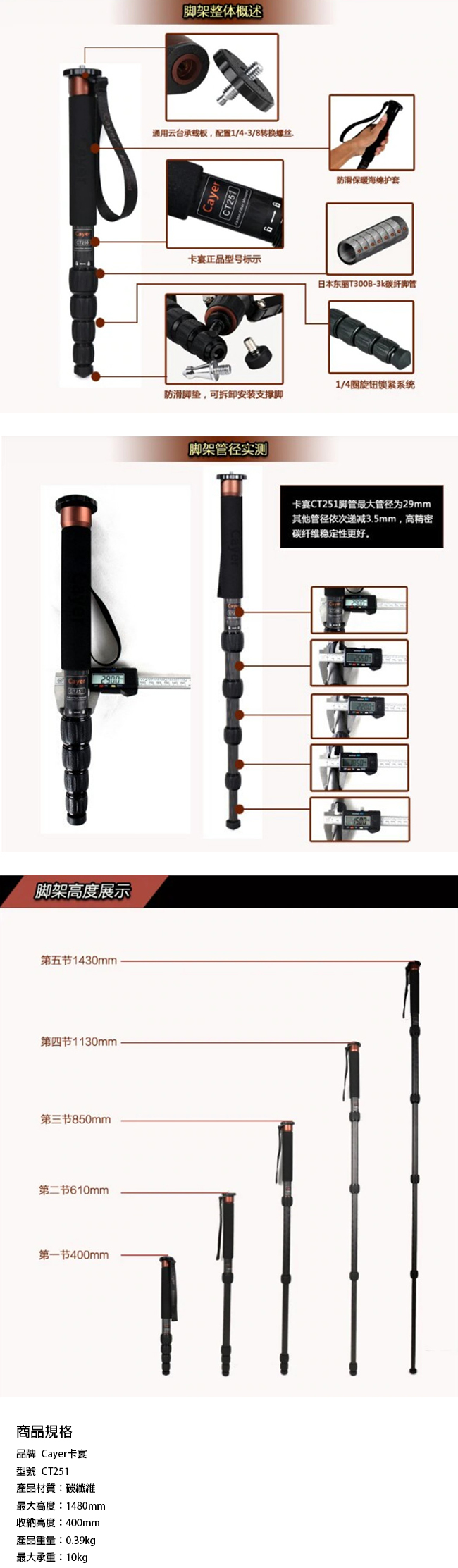 ★閃新★Cayer 卡宴 CT251 碳纖維 5節 快轉固定鎖 單腳架 攝影 錄影(公司貨)