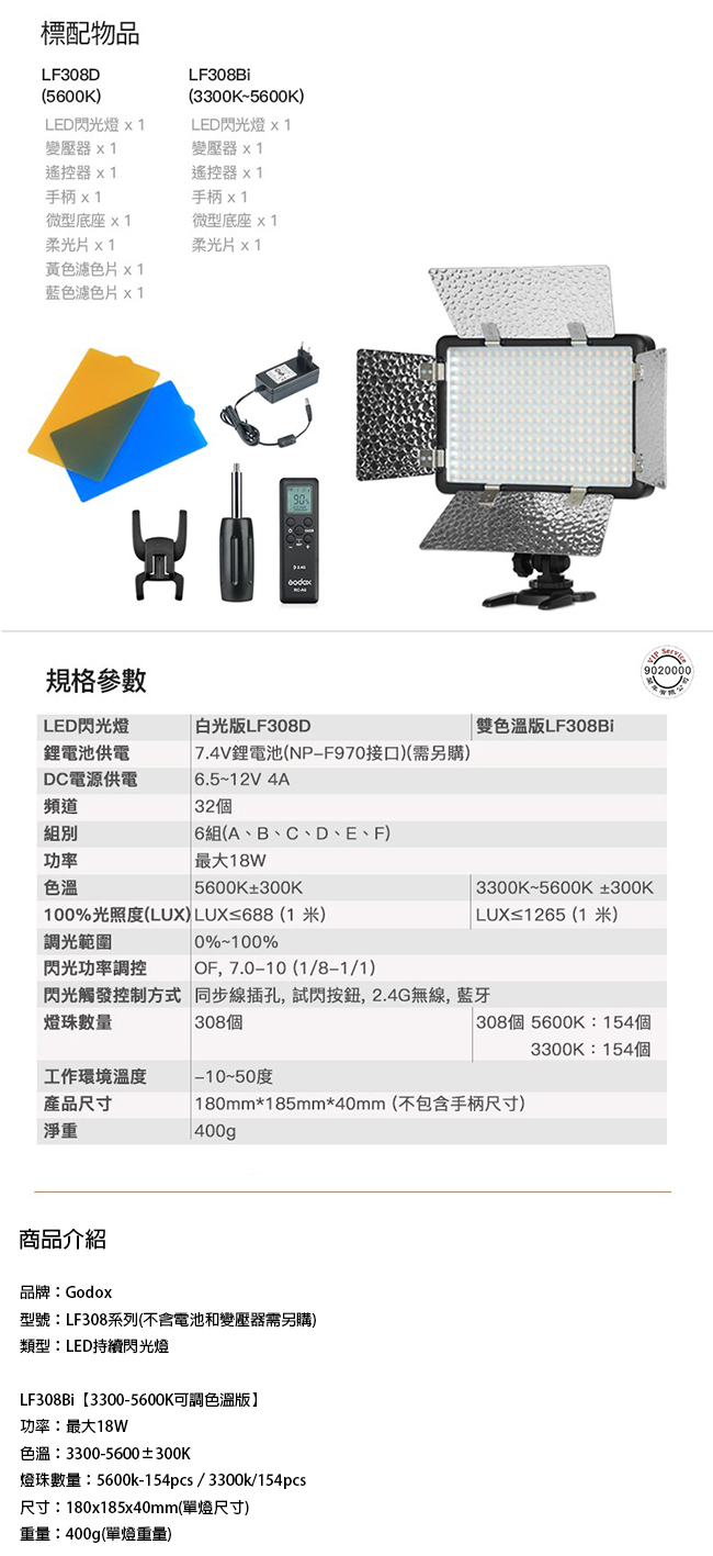 ★閃新★Godox 神牛 LF308Bi LED308 LED燈 閃光燈 攝影燈 可調色溫 攝影(308,公司貨)