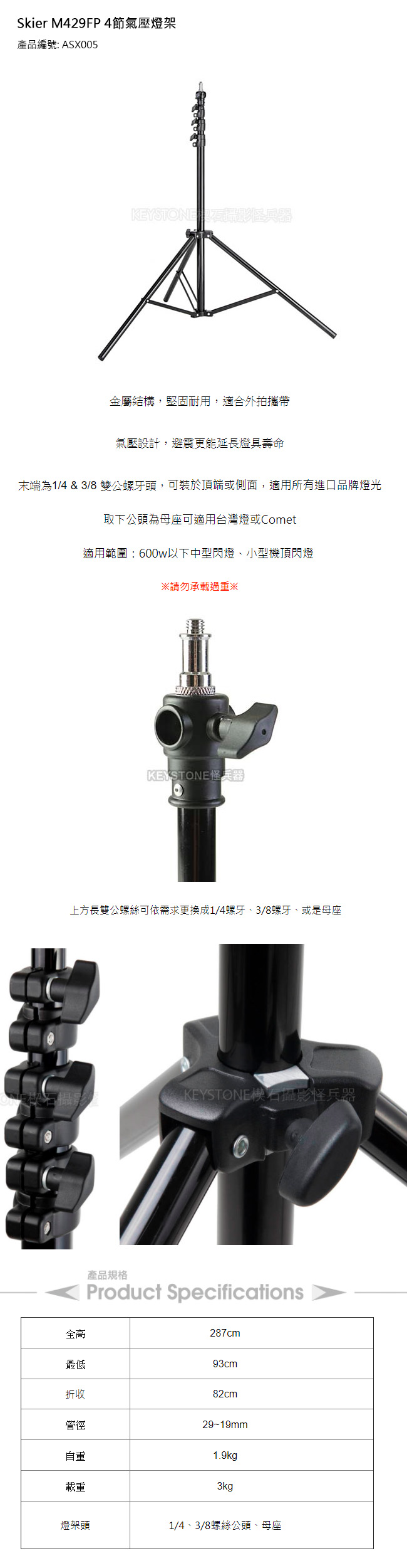 適用600W以下中型閃燈,承重3kg