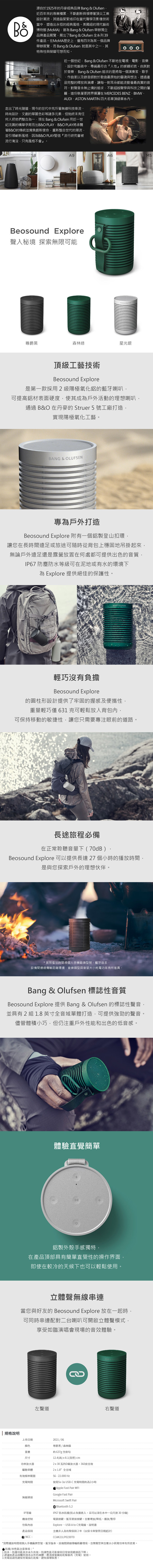 ★閃新★ B&O Beosound Explore 探索 無線 藍牙喇叭 音樂 音響 露營 活動 派對 戶外 防水 耐摔 黑/銀/綠 (公司貨)
