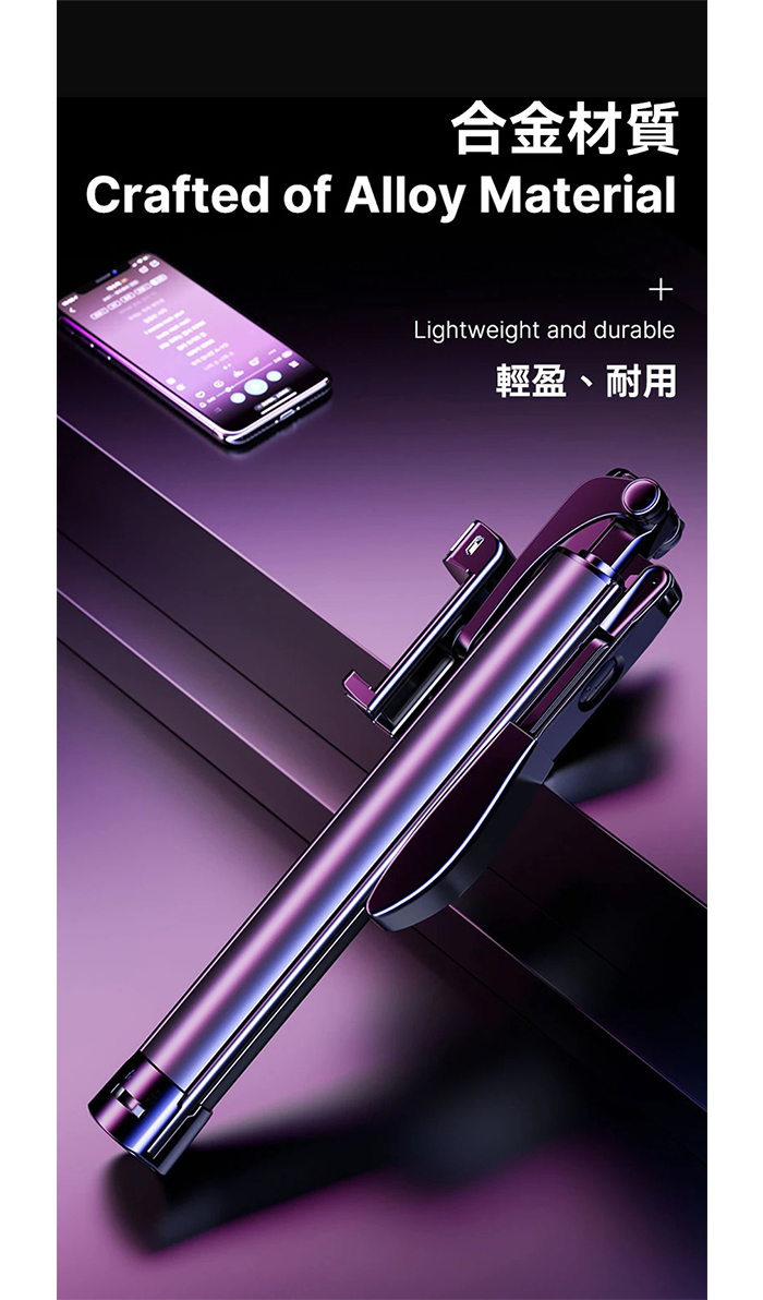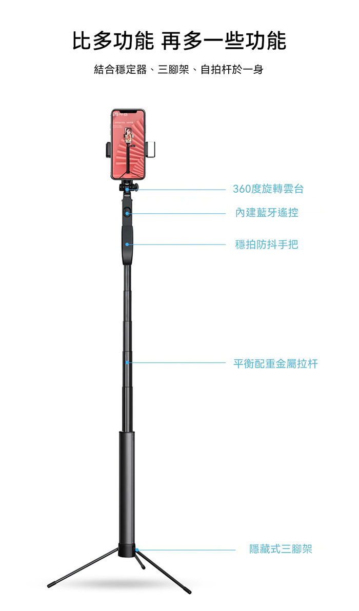- 一體式設計,結合穩定、藍牙、自拍杆於一身 - 獨特的穩定手把設計,均衡防抖 - 自帶補光燈,案光環境也能拍出清新畫面 - 360°雲台穩定全景拍攝 - 嵌入式無線遙控器 - 平衡配重金屬腳管 - 採用合金材質製作 - 可從 32cm 延伸至160cm