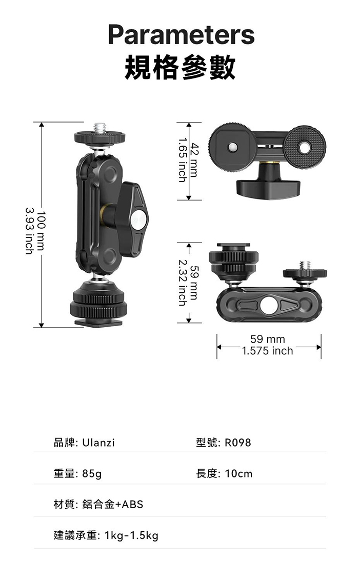 ★閃新★Ulanzi R098 冷靴 雙球頭 魔術手 1/4芽 冷靴座 可用於外接螢幕 錄影(R098,公司貨)