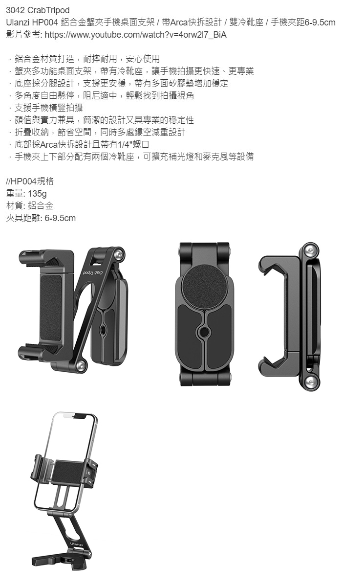 ★閃新★Ulanzi HP004 手機 三脚架 站立架 支架(1/4芽孔、阿卡燕尾槽,雙冷靴)