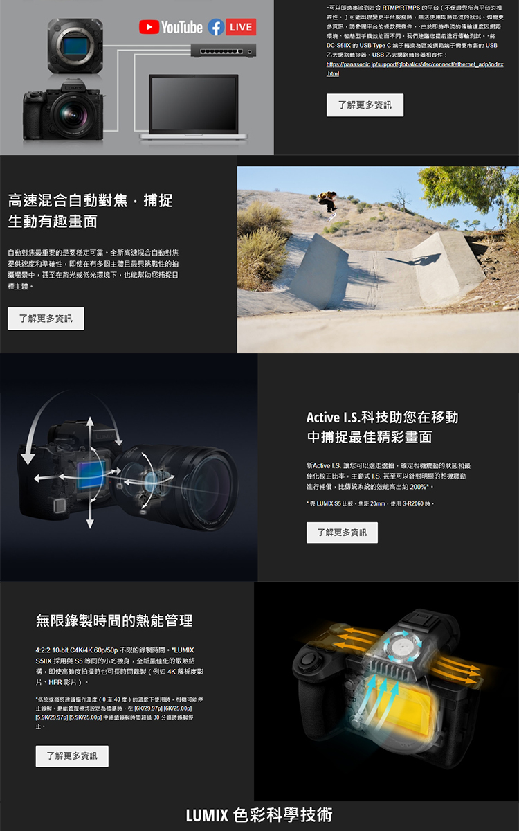 PDAF 和 I.S. 等進階功能(影像穩定)使用 LUMIX S5IIX 感受實質有益的體驗。使用這款小巧的全片幅無反光鏡相機拍攝優質的相片和影片並無限錄製,並享受更高的機動性。