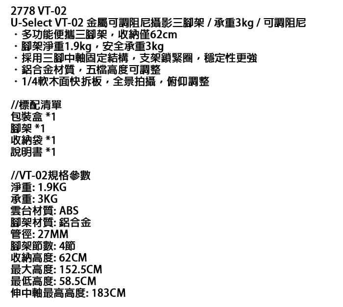 腳架淨重1.9kg,安全承重3kg