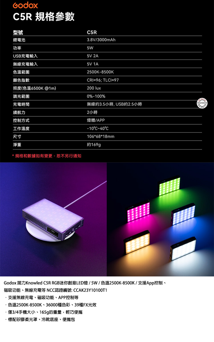 ☆閃新☆Godox 神牛 諾力 Knowled C5R RGB LED燈 支援App、磁吸功能、無線充電(C5 R,公司貨)