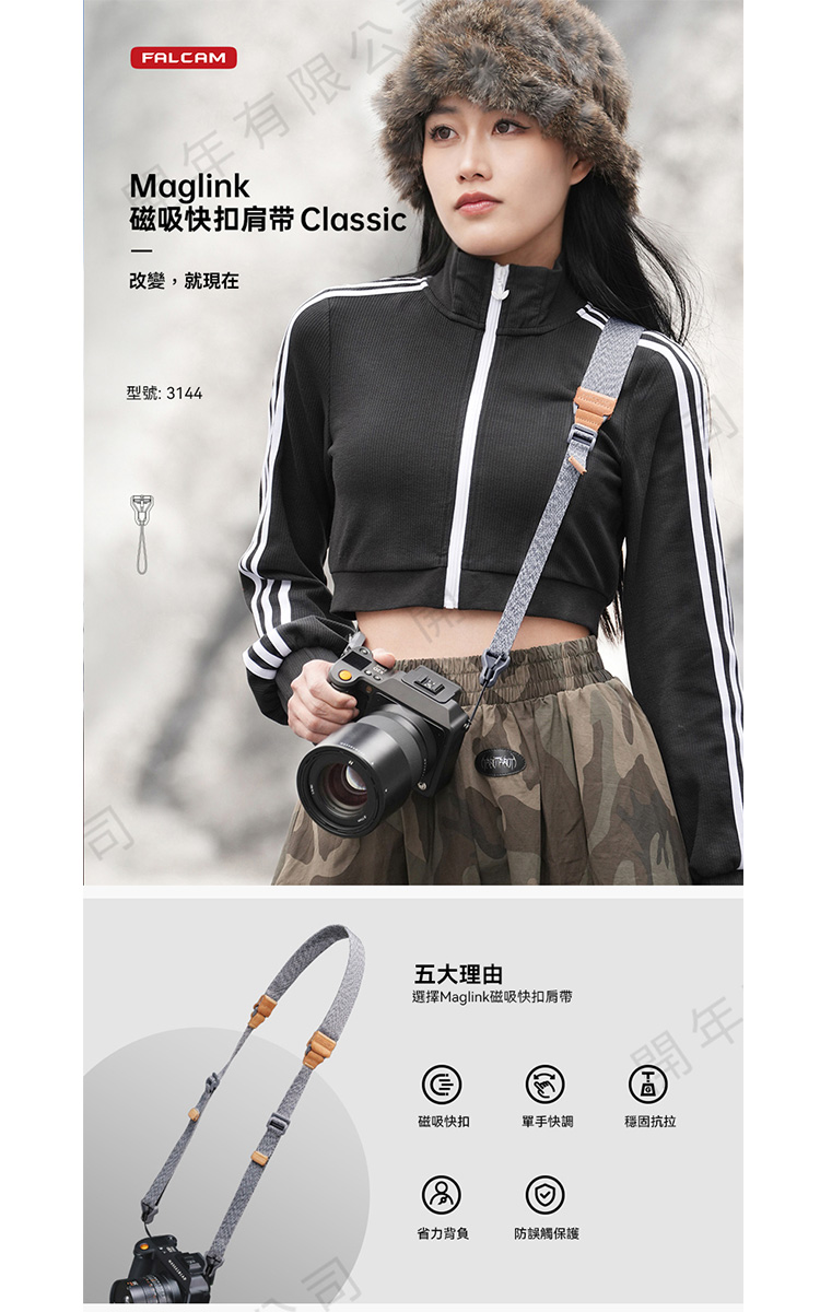 新的磁性快扣設計:快扣內建磁鐵,可在不收納肩帶的情況下拆卸相機