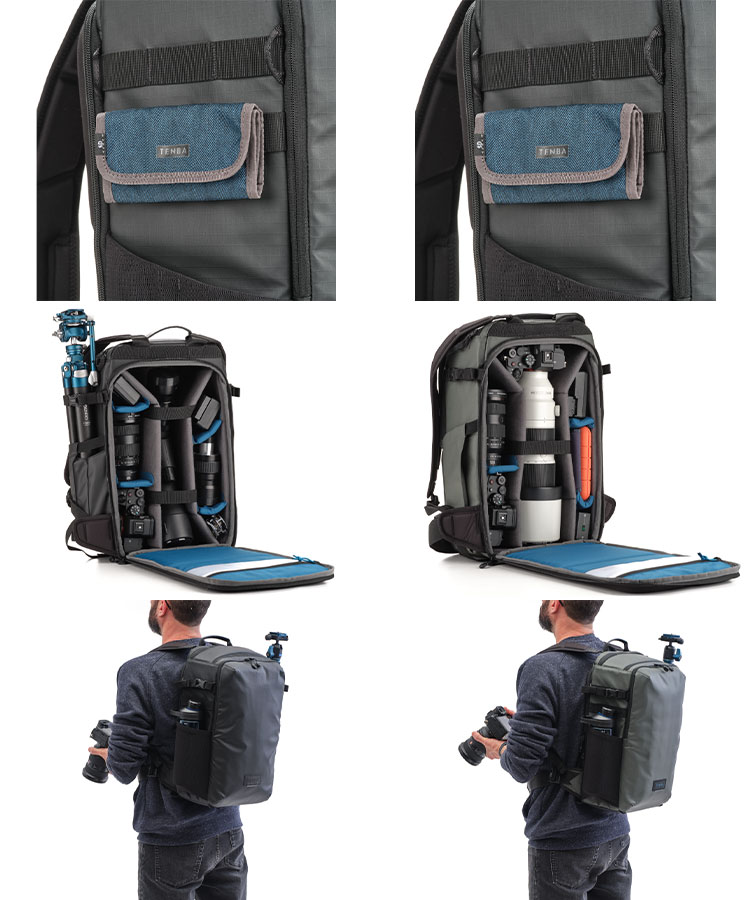 .旋轉式背部取用設計:背包具有後部開口設計,可讓包包像懸浮工作台一樣安全地掛在身上;同時確保相機裝備靠在使用者背部,旅途中無法從背包的前面或側面取走物品