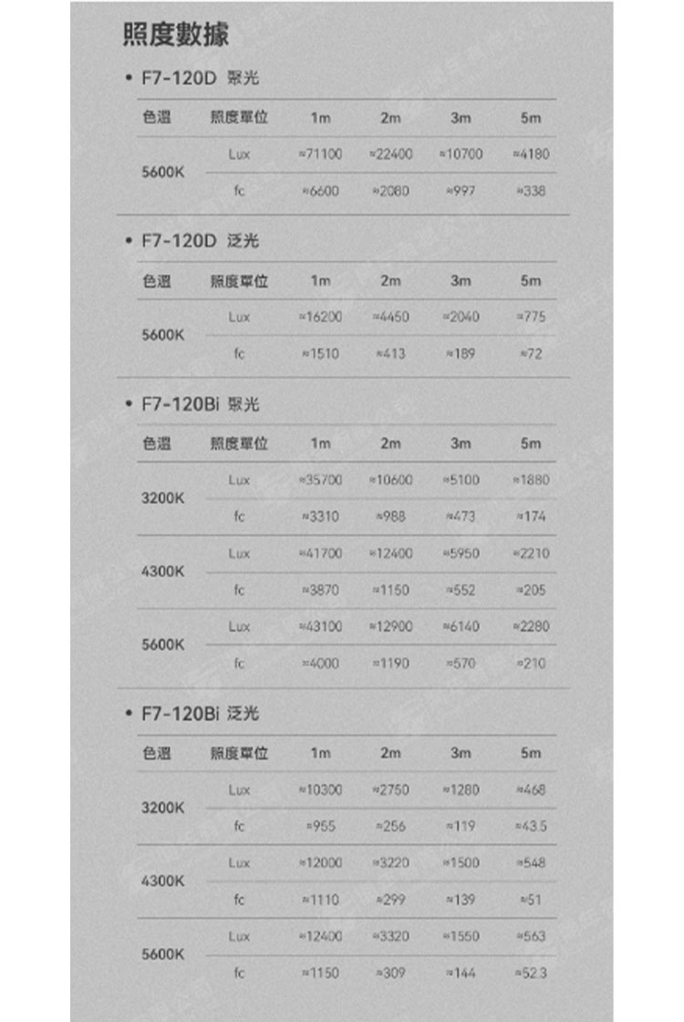 聚光亮度(5600K, lux): 白光版 71100@1m, 10700@3m ; 雙色溫版43100@1m, 6140@3m